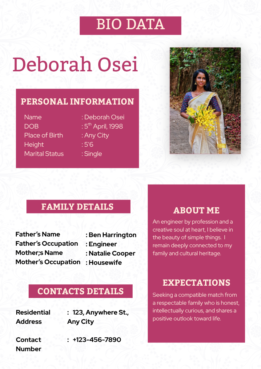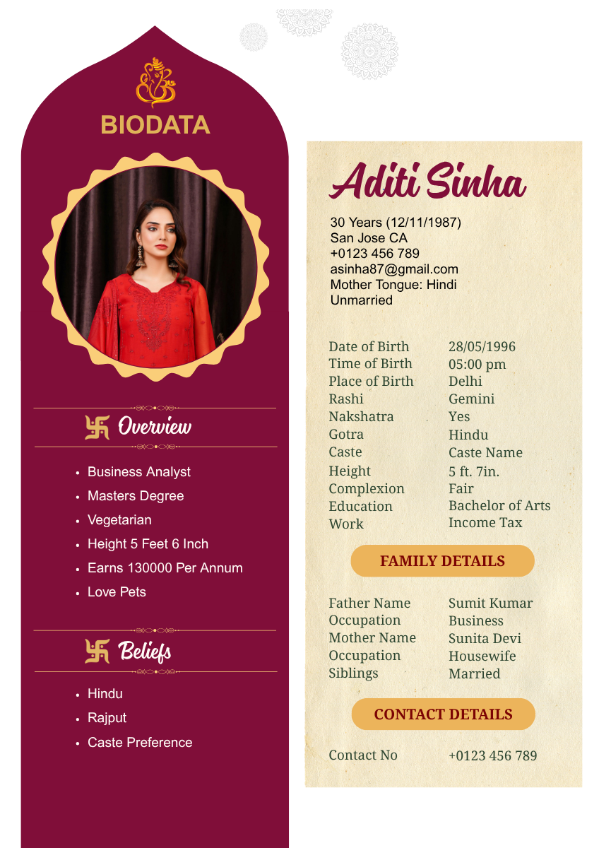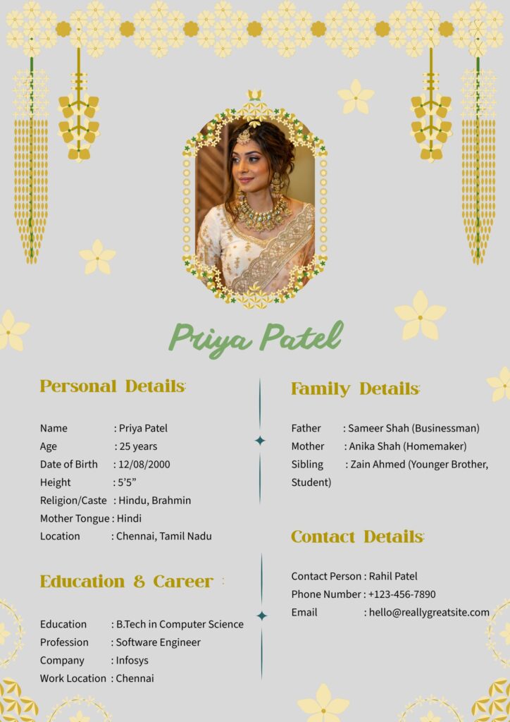 Our marriage bio-data designs help you showcase your personality, values, and background in the best possible way making a strong and lasting first impression for meaningful connections.